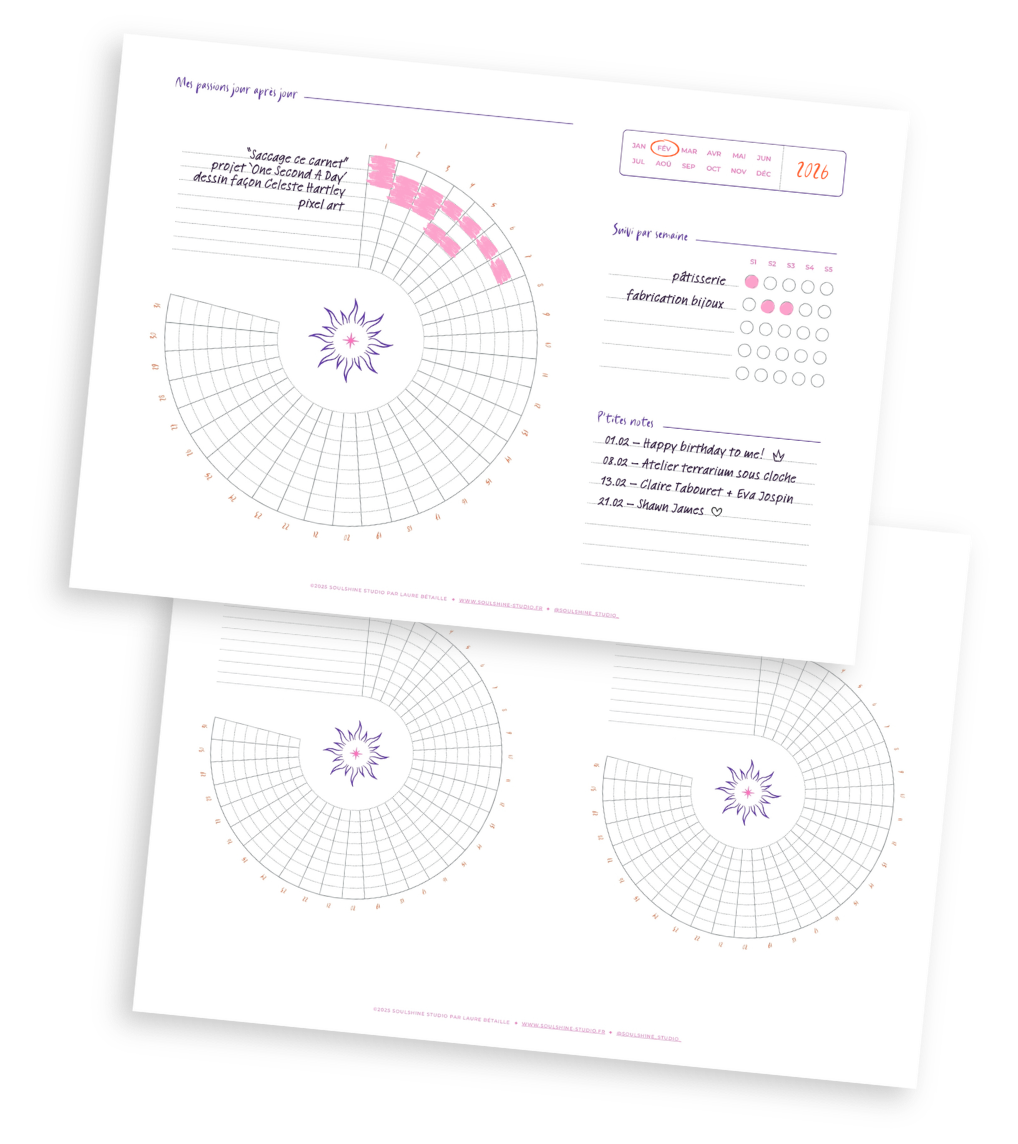 ✦ Tu y listes tes passions / activités créatives du moment : chaque jour, tu colories la case correspondant à la passion que tu as nourrie. Parfait pour observer sans juger ton flow !